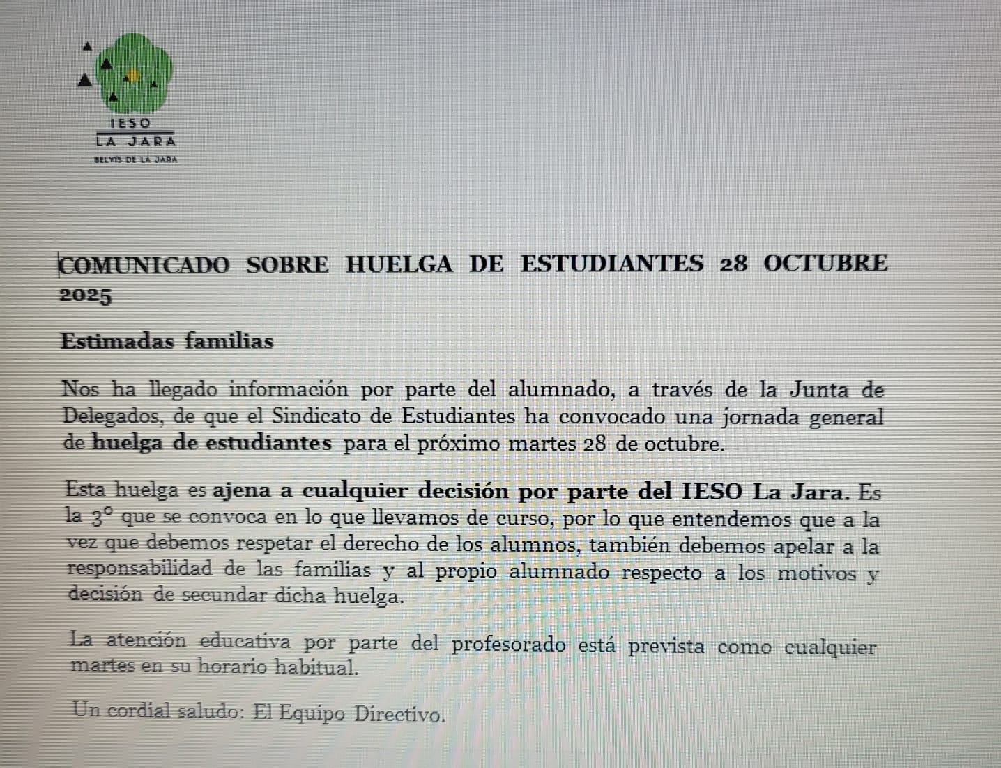 Nos ha llegado información por parte del alumnado, a través de la Junta de Delegados, de que el Sindicato de Estudiantes ha convocado una jornada general de huelga de estudiantes para el próximo martes, 28 de octubre. Esta huelga es ajena a cualquier decisión por parte del IESO La Jara. Es la tercera que se convoca en lo que llevamos de curso, por lo que entendemos que a la vez que debemos respetar el derecho de los alumnos, también debemos apelar a la responsabilidad de las familias y al propio alumnado respecto a los motivos y decisión de secundar dicha huelga.
